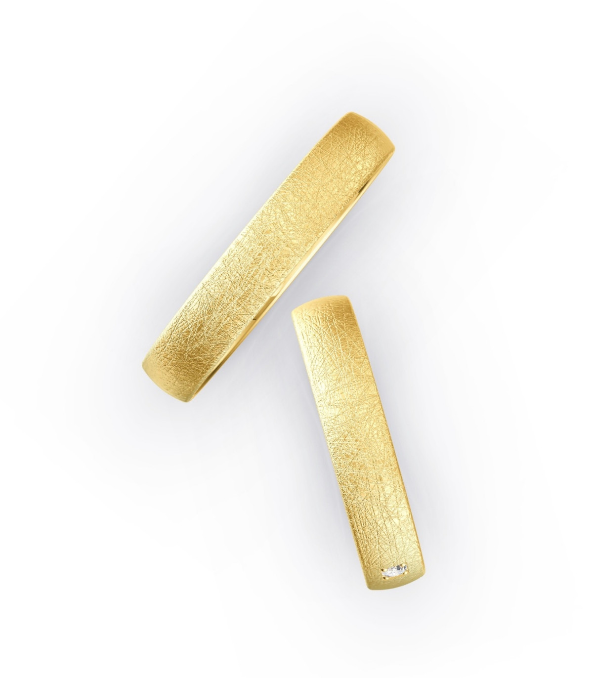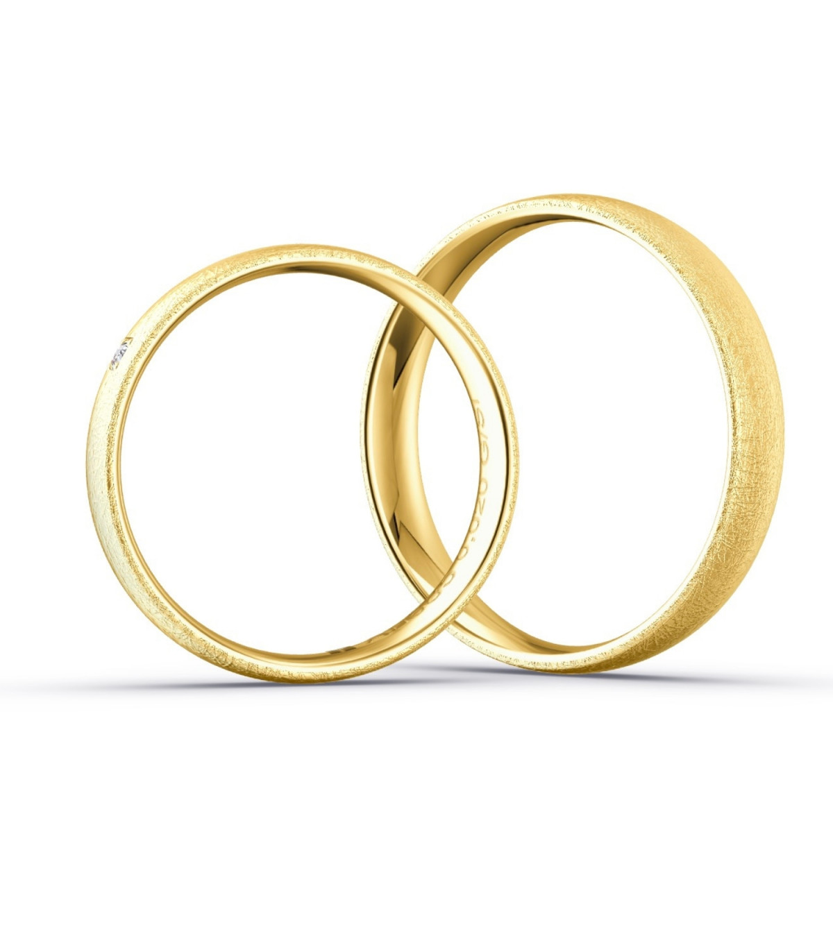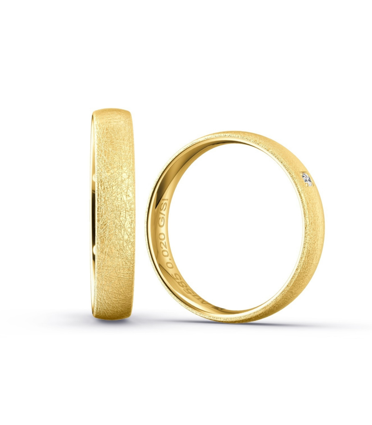 Entdecken Sie unsere eleganten Eheringe aus edlem Gelbgold mit einer Breite von 4 mm. Die Außenseite der Ringe ist mit einer modernen ICEMAT-Oberfläche veredelt, die für eine besondere, matte Eisstruktur sorgt und dem Ring einen stilvollen, zeitgemäßen Look verleiht. Der Damenring ist zusätzlich mit einem funkelnden Diamanten besetzt, der dem Ring eine exklusive und feminine Note verleiht. Die Kombination aus klassischem Gelbgold, moderner ICEMAT-Struktur und strahlendem Diamanten macht dieses Ringpaar zu einem perfekten Symbol Ihrer Liebe.
